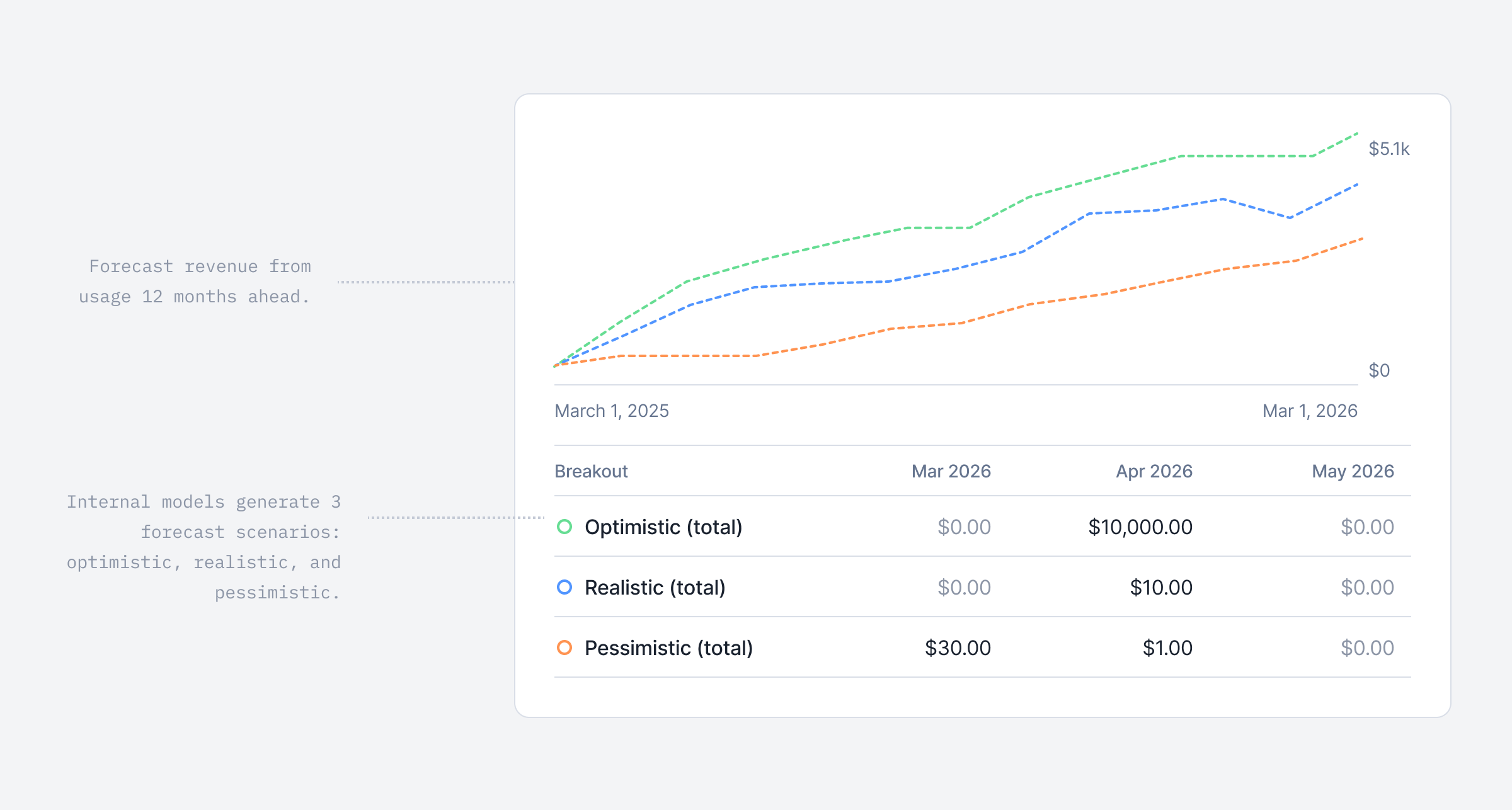 Forecasting revenue is notoriously challenging, especially for usage-based companies. Usage fluctuates over time, definitions of revenue vary from a company to another, and reliable prediction models are often missing.At Lago, we set out to make this process easier!We have introduced our first ML model to forecast your usage-based revenue up to 12 months ahead. The model provides three scenarios: Realistic, Pessimistic, and Optimistic, and regularly refines its predictions based on your invoiced usage data.