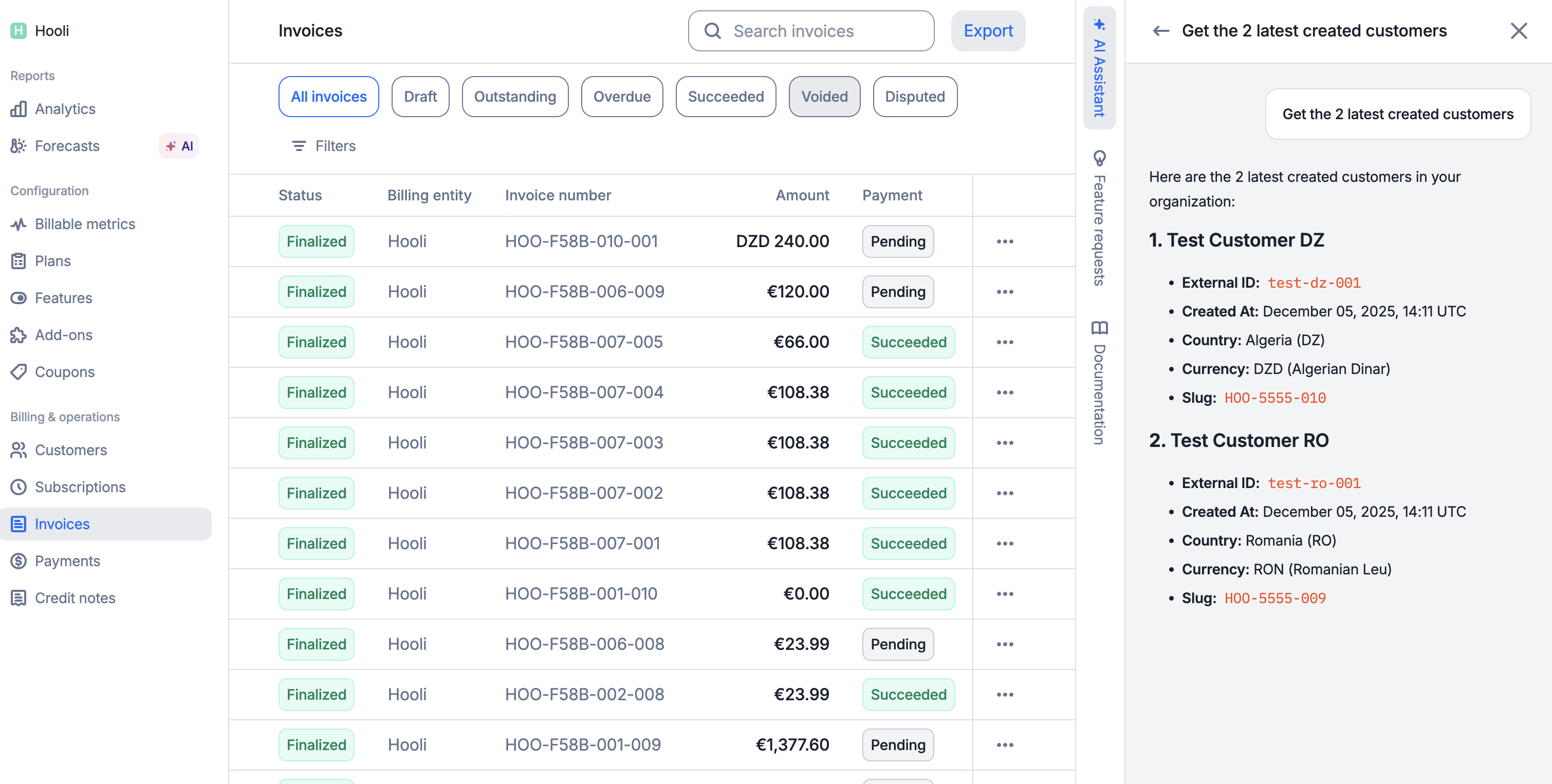 For operations that modify data, delete data or create any important billing operations, the Billing Assistant requires explicit confirmation to protect against accidental changes. Here is an example:- You: “Terminate subscription for Acme Corp”