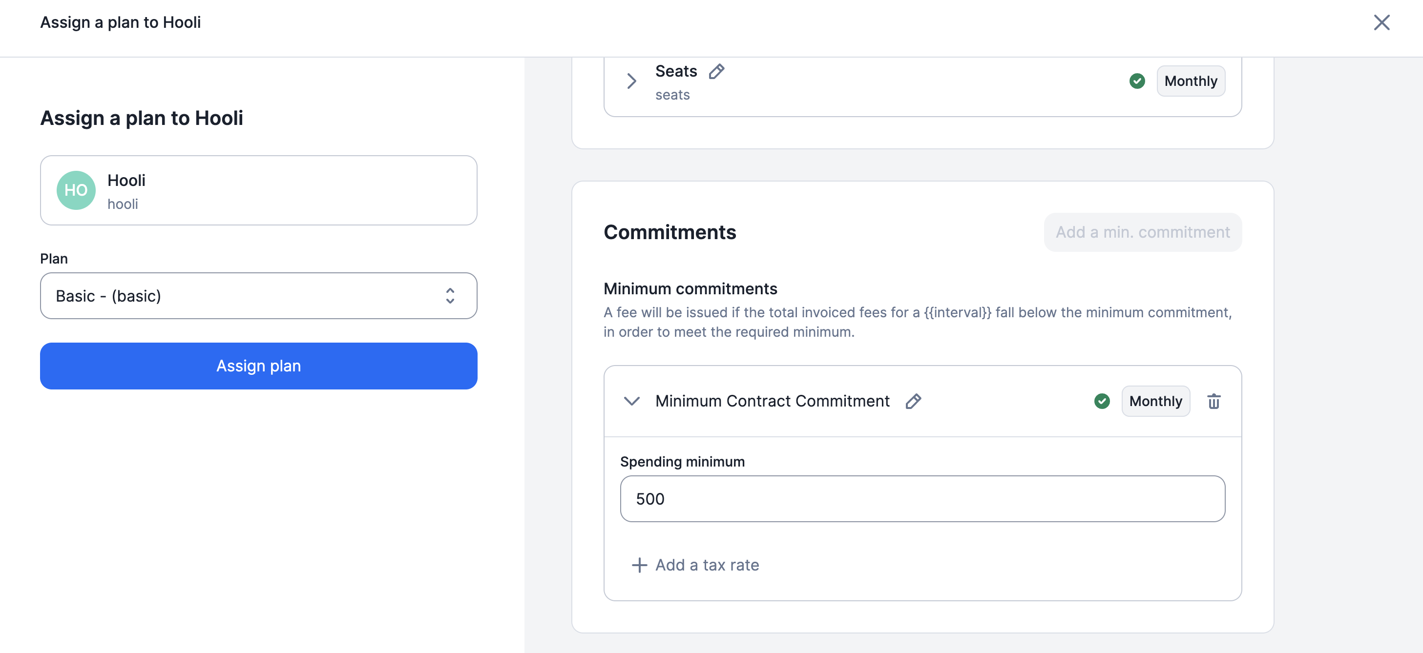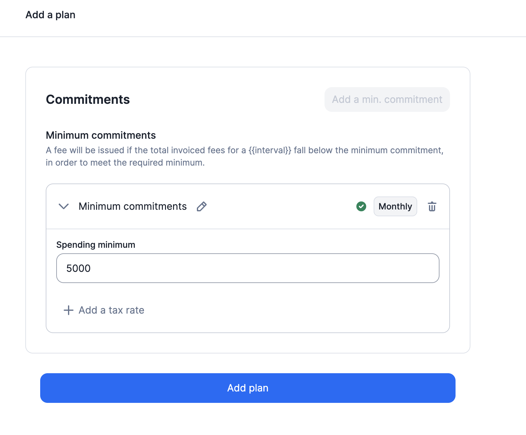 The minimum commitment must follow the plan’s interval. You can add a specific tax rate for this minimum commitment.