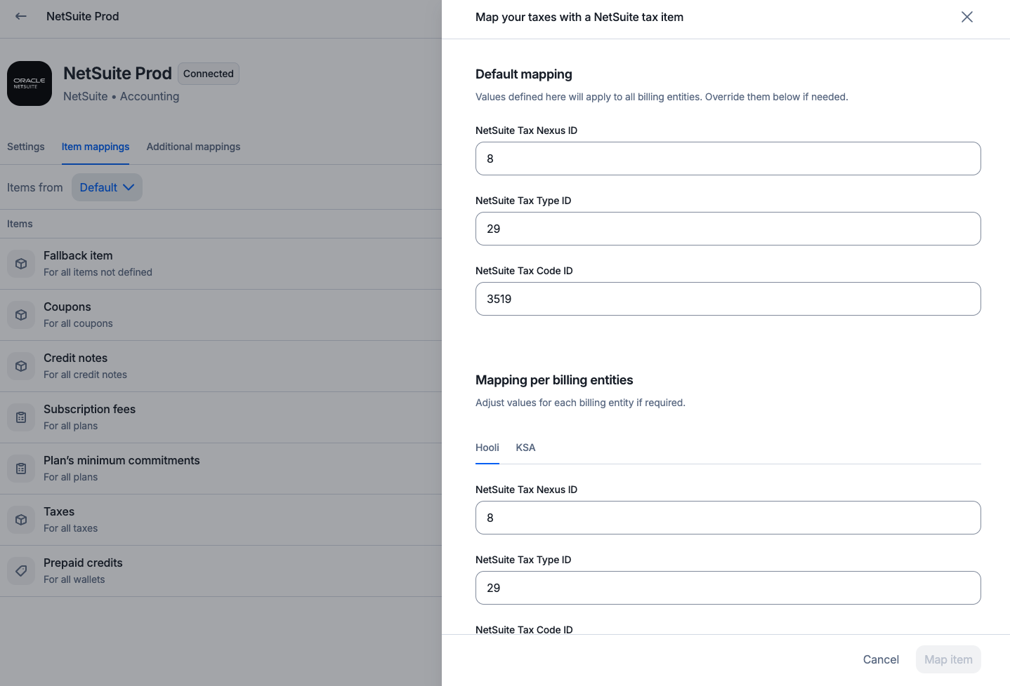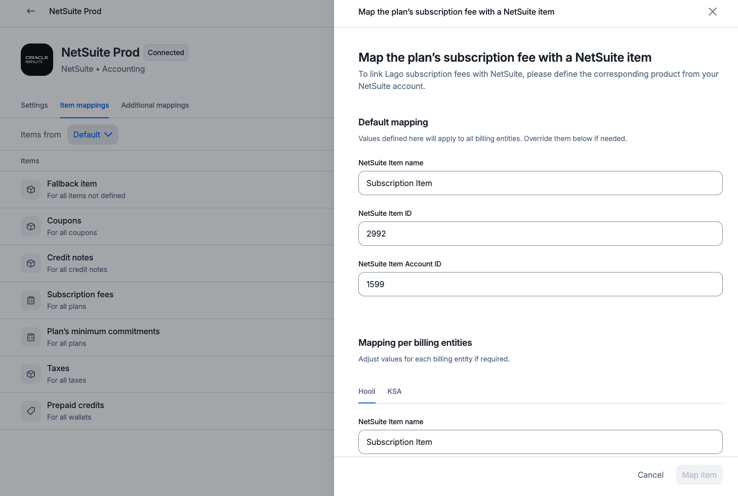 Map items per entity and subsidiary between Lago and NetSuite