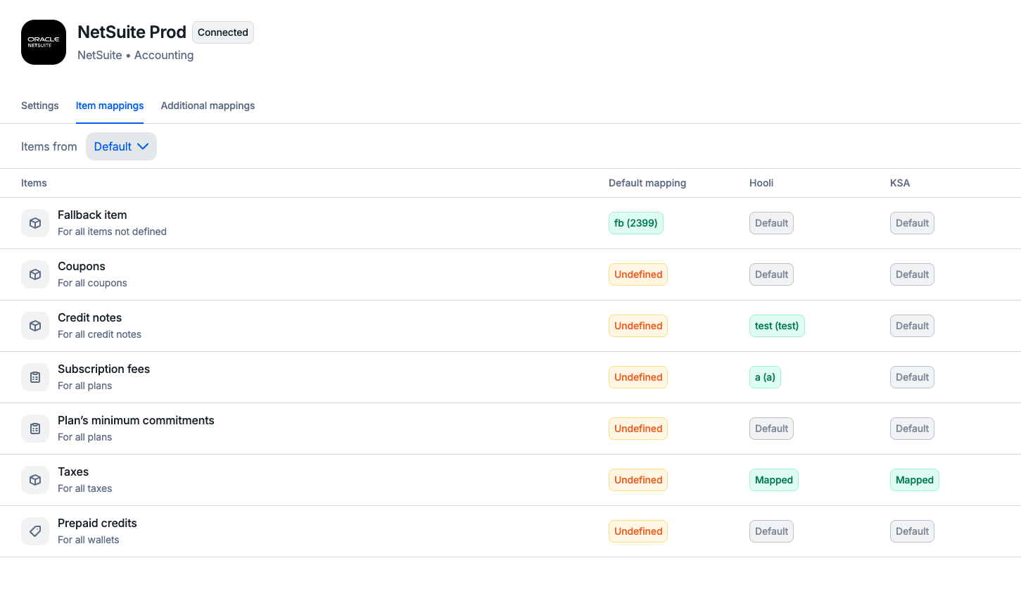 Coupons, credit notes, subscription fees, minimum commitments, and prepaid credits require a one-to-many mapping. Each of these objects must be mapped to a single default item from your NetSuite instance. Lago will use this mapped item whenever any of these objects appear on the final invoice sent to NetSuite. You can override the default mapping for each Lago entity or NetSuite Subsidiary if needed.This mapping follows a one-to-many structure, meaning a single item can handle multiple mappings for coupons, credit notes, subscription fees, minimum commitments, and prepaid credits.