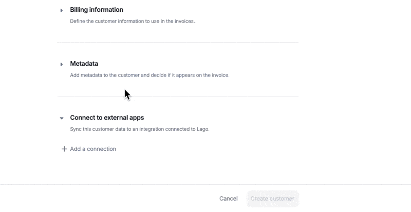 - Navigate to the customer creation screen in Lago