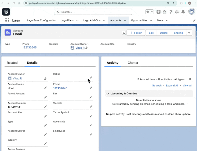 Before you begin applying coupons, you’ll need to ensure your Salesforce environment is properly configured. The “Apply Coupon” action button must be available in your account page layout or lightning record page. If you don’t see this button, work with your Salesforce administrator to add it through the page layout editor or lightning app builder. Once your environment is configured, follow these steps to apply a coupon to a customer account:- Navigate to the Account Details> Access the account details page for the customer who will receive the coupon.